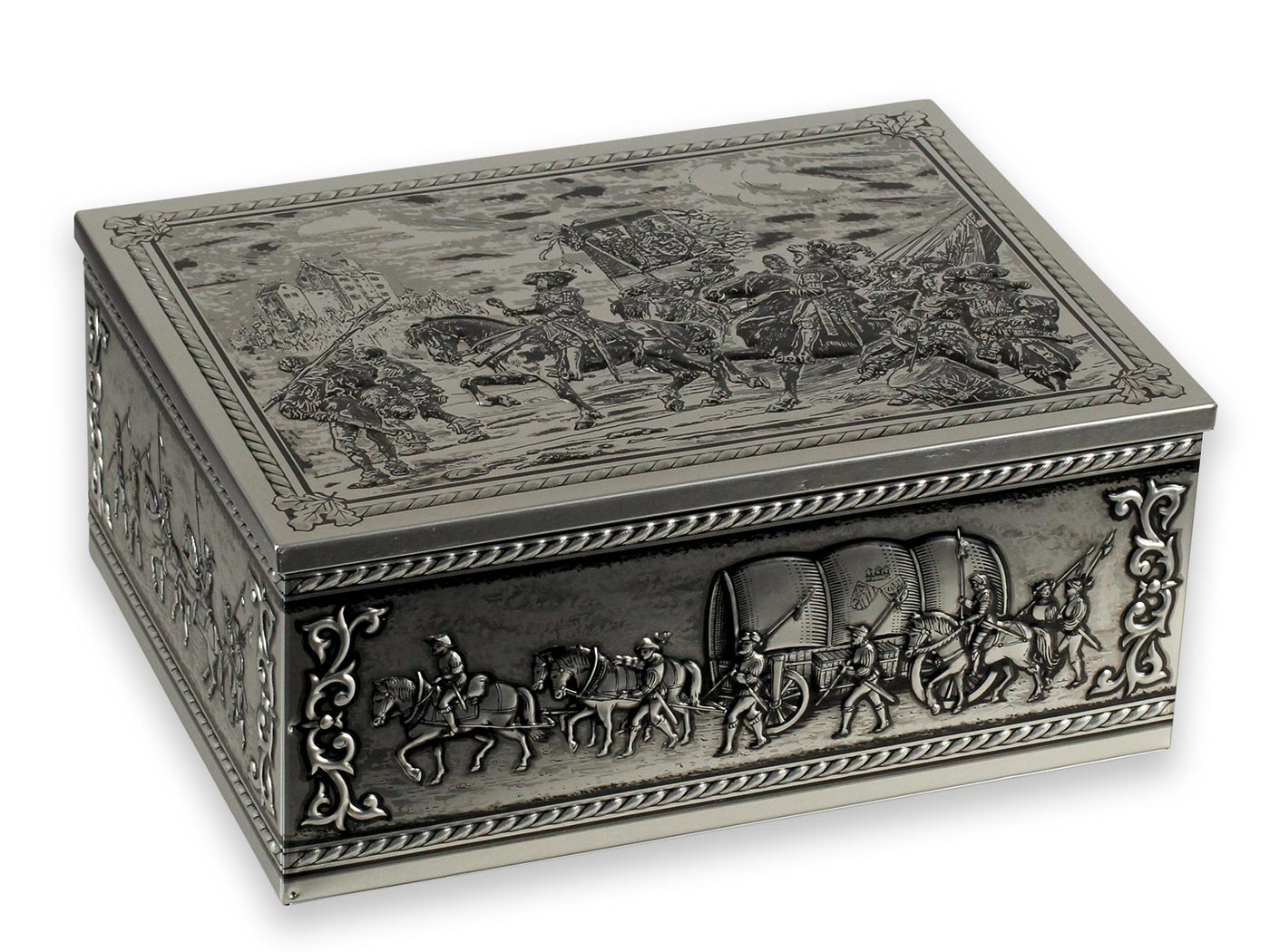 Die silberne Metallschatulle mit einem ritterlichen Motiv ist mit der ganzen Vielfalt unserer weihnachtlichen Gebäcke gefüllt. Hier ist für jeden Geschmack etwas dabei.