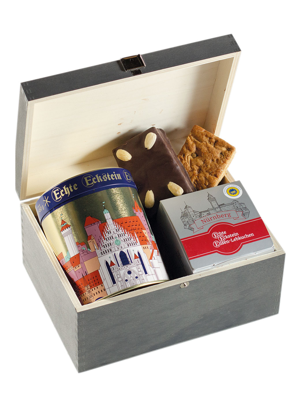 Unsere Holzschatulle im neuem, zeitlosem Design ist gefüllt mit Ecksteins Spezialitäten. Original Nürnberger Lebkuchen und erlesenen Honigkuchenspezialitäten. Eine geschmackvolle Geschenkidee zum Fest.