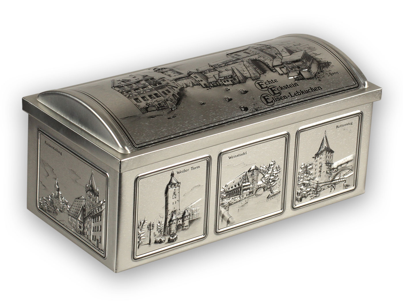 Diese festliche Metalltruhe mit gewölbtem Deckel und Motiven von Nürnberger Türmen und Brücken haben wir für Sie mit erlesenen Lebkuchen-Spezialitäten gefüllt.